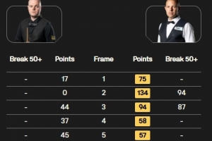巴里·霍金斯打出三杆50+(94、87、73),连胜六局,最终6-0横扫埃利奥特·斯莱瑟,晋级8强。