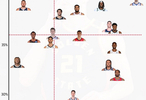 纵坐标为三分命中率,横坐标为篮下防守率。