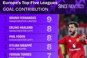 据Squawka统计,B费今年11月以来9场英超比赛参与9粒进球,五大联赛同期参与进球最多。