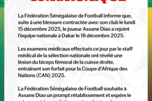 国家队医疗团队今日进行的检查显示,阿萨尼·迪奥右大腿股二头肌受伤,无法参加本届非洲杯。