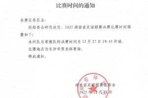 体育资讯12月25日讯 根据官方消息,湘超决赛调整至12月27日19:45进行。