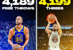 库里生涯至今共命中4199记三分,比他命中的罚球数(4189个)还多。