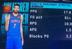 据统计,在最近10场比赛中,霍姆格伦场均可以得到17.8分10篮板1.5助攻3.2盖帽,投篮命中率高达61%!