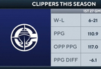 快船前27场 战绩6胜21负 场均得分110.9 场均失分117.0 场均净胜分-6.1