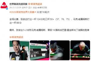 体育资讯02月03日讯 今日,2026斯诺克世界大奖赛32进16轮次,张安达5-2击败马克·威廉姆斯,晋级16强。