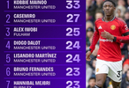 1. 科比-梅努(曼联)– 33次