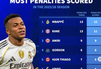 姆巴佩13罚12中居首;凯恩13罚11中排名第二;阿米里9罚9中排第三